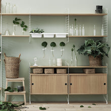 Selon la longueur des éléments que vous choisirez, votre système de rangement String sera d'une longueur de 60 cm ou de 80 cm. Vous avez le choix entre plusieurs types d’éléments : étagère simple (L 58 cm ou L 78 cm), porte-revues (L 58 cm ou L 78 cm), étagère avec 3 bacs (L 78 cm), caisson avec portes coulissantes ou caisson avec tiroirs. Les étagères et caissons se disposent librement dans les montants latéraux en fils d'acier.